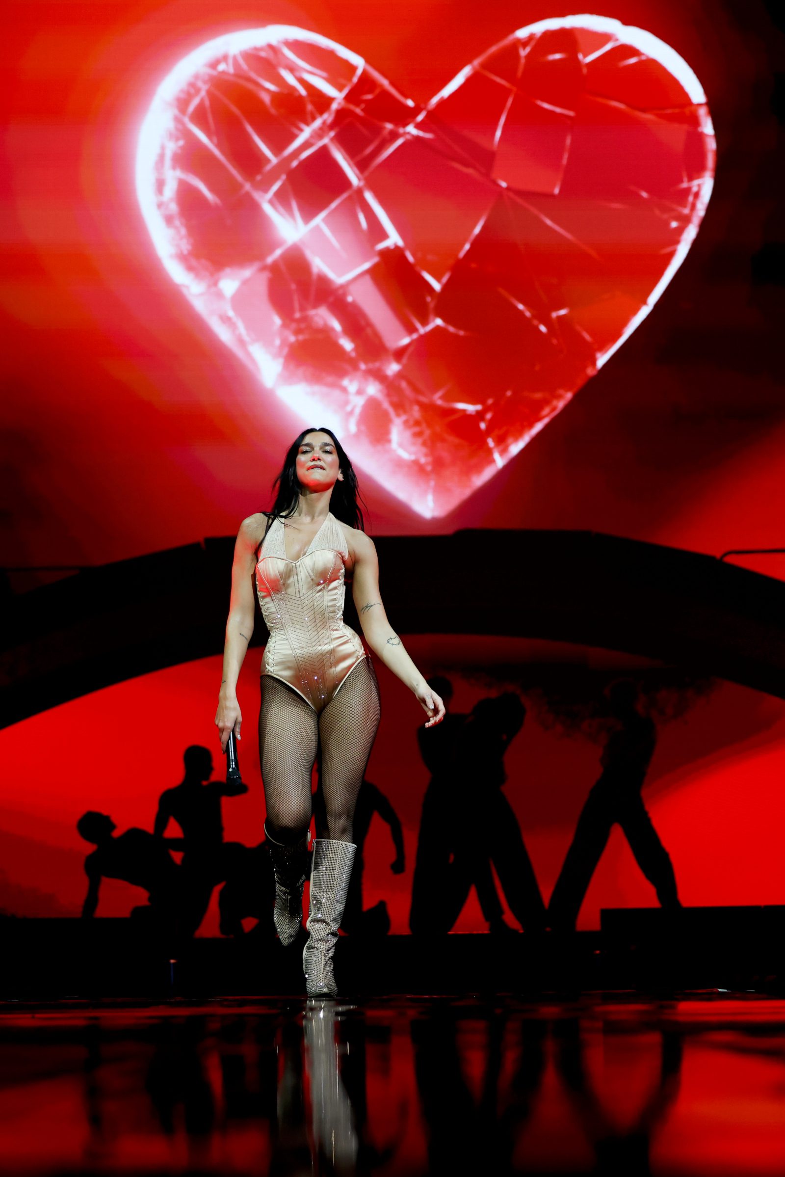 Dua Lipa Legs Fishnet Outfit Sydney March 29, 2025 1600 × 2398 Dua Lipa’s Legs Stole the Stage in Fishnets & Heels — Sydney Couldn’t Handle Her! Dua Lipa turns heads in Sydney with her toned legs in fishnet tights, wearing a satin corset bodysuit that hugs her curves, paired with sparkly thigh-high boots and dramatic stage lighting behind a glowing red heart.