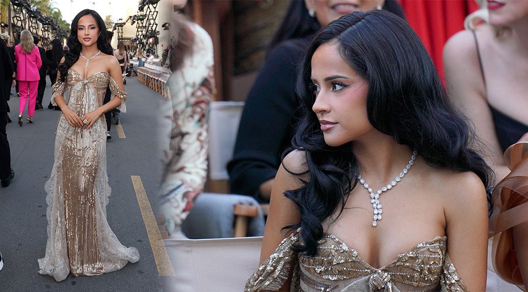 Becky G Boobs October 27, 2025 1038 × 576 Becky G Unleashes Sizzling Cleavage in Gold Sequin Gown at Vogue World